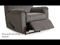Frame constructions have been rigorously tested to simulate the home and transportation environments for improved durability. Frame components are secured with combinations of glue, blocks, interlocking panels and staples. Stripes and patterns are match cut. All fabrics are pre-approved for wearability and durability against AHFA standards. Cushions are constructed of low melt fiber wrapped over high quality foam. Features metal drop-in unitized seat box for strength and durability. All metal construction to the floor for strength and durability. The zero wall reclining mechanism features infinite positions for comfort.